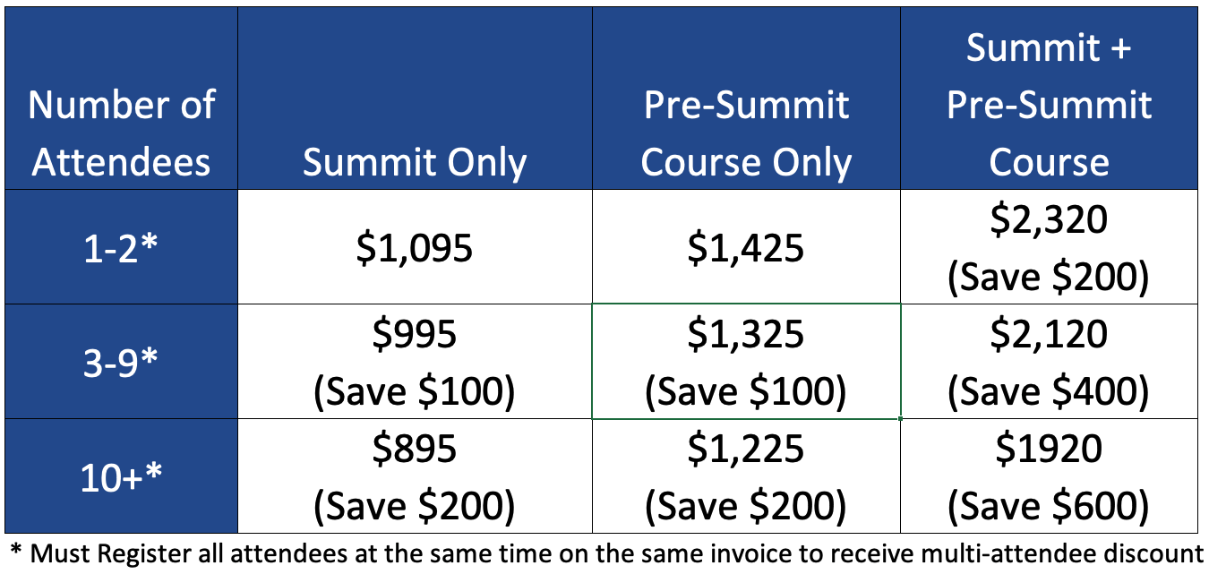 When you register for the Summit and a pre-Summit Course, you will SAVE $200 OFF the course fee. This happens automatically when you register using the Summit Registration website…