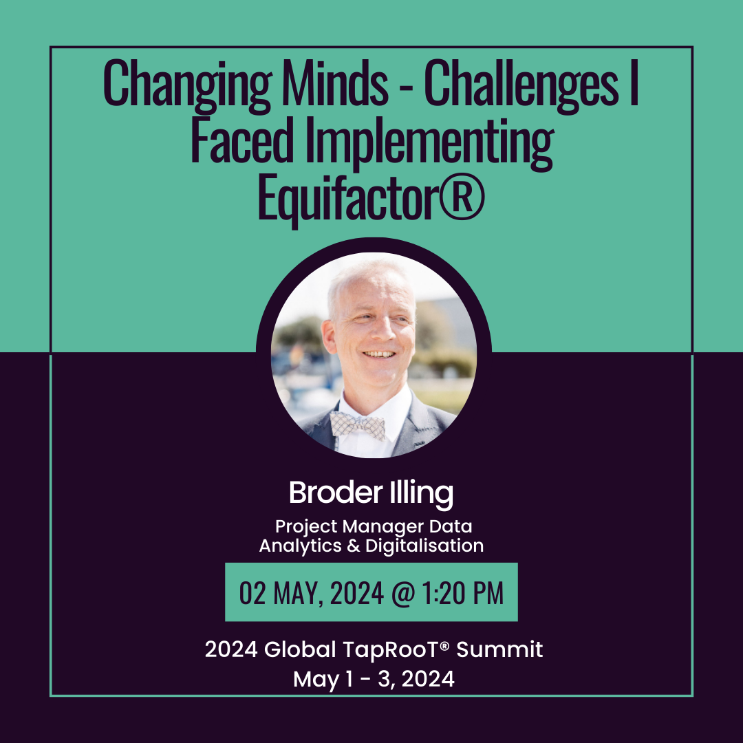 If you want to learn how to implement Equifactor® successfully and overcome challenges, this session is right for you! Join us at the 2024 Global TapRooT® Summit May 1 – 3. This session occurs on Thursday, May 2, 2024, at 1:20 PM. Make sure you schedule your return flights home after the Summit ends on Friday at noon. You won’t want to miss everything the Summit has to offer.