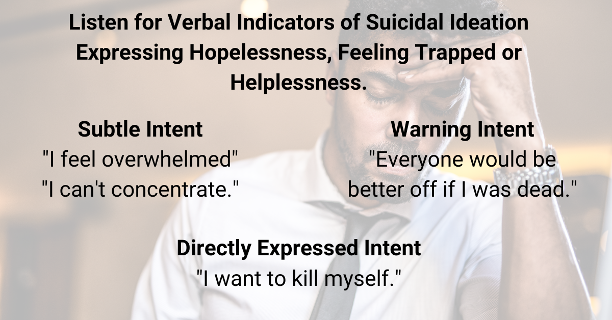 Creating a psychologically safe environment involves listening more than knowing the right words to say. Someone struggling with suicidal ideation will shift from being left-brain dominant (logical) to right-brain dominant (emotional). Have you noticed a worker’s words are more emotionally charged? The way someone would verbally express themselves changes as indicated in the image below. These expressions may range from very subtle to very direct.