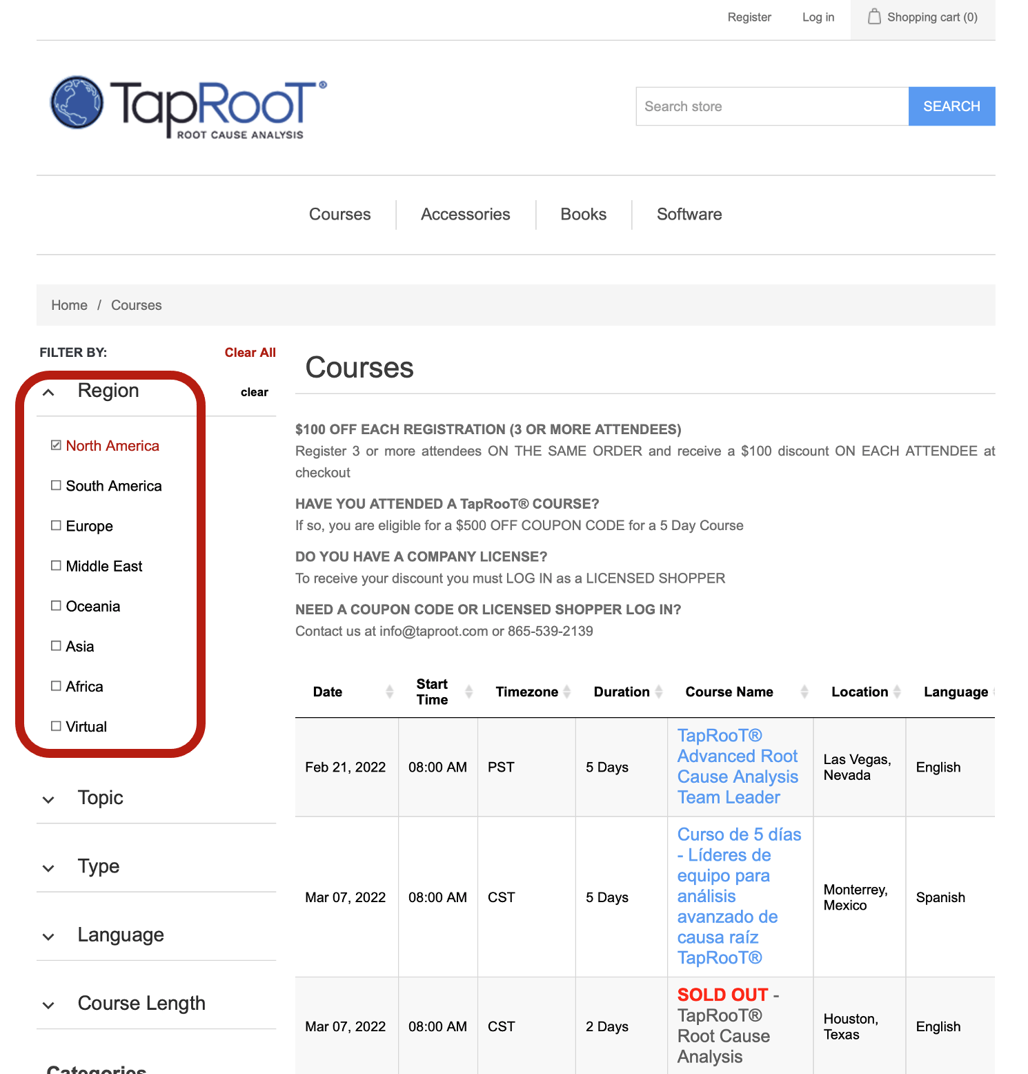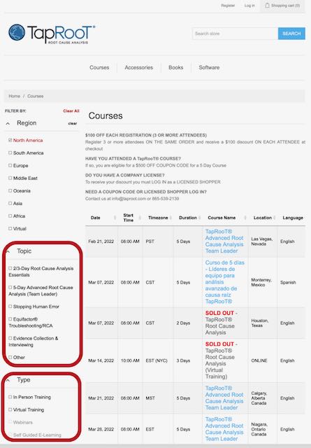 Detailed Procedure for Finding a TapRooT® Course Using the Store