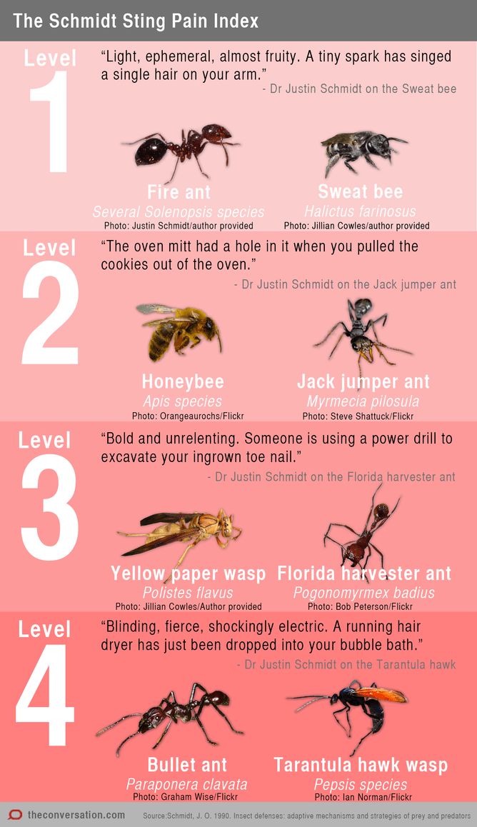 Source: Justin Schmidt, “I Have Terrifying Large Things Sting Me, For Science,” https://www.huffpost.com/entry/insect-stings-pain_n_56a287bee4b0d8cc109a02b5.