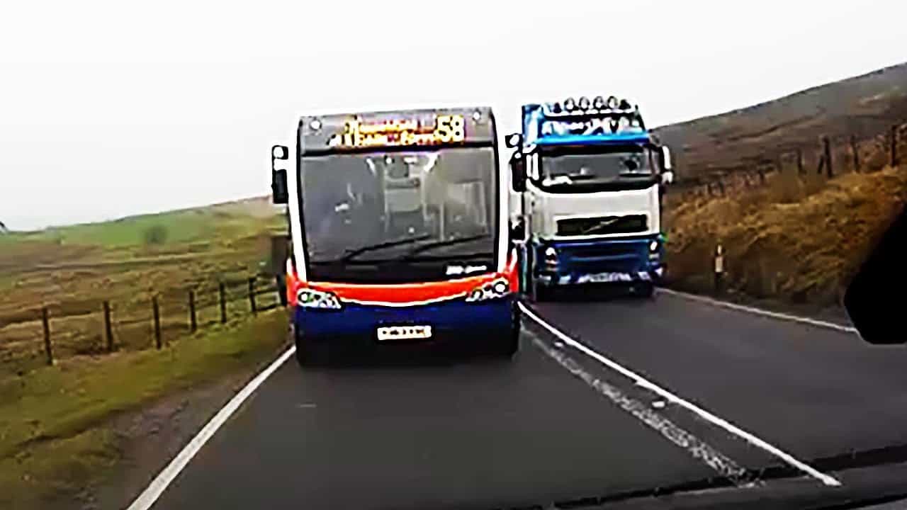 Take a look at the bus driver and what side they are sitting in. This is clearly the bus passing the truck and you are looking out the front window at the on-coming bus.