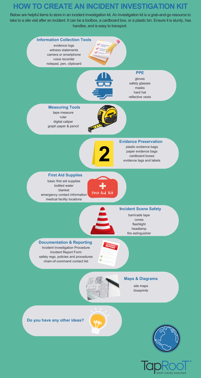 Many of our clients prepare grab-and-go investigation kits. When an incident occurs, they are ready to do a site visit and are assured they will have everything they need when they get there. The following infographic will give you ideas about how to put one together.