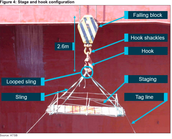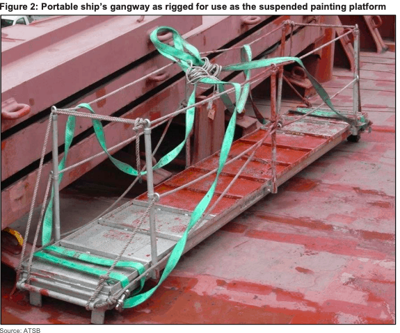The decision was made to jury-rig a portable gangway into a work stage which could then be suspended from the cargo crane hook via slings. The ship’s crew members had several discussions, made plans, and completed a risk assessment in accordance with the safety management system requirements. However, the equipment and machinery use was contrary to company policy and procedures.