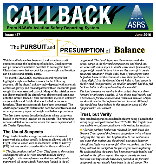 The errors reported in this Aviation Safety Reporting System “Call Back” article are simple but serious. If you load a plane wrong, it could crash on takeoff. Click on the picture of the article below to read the whole report.
