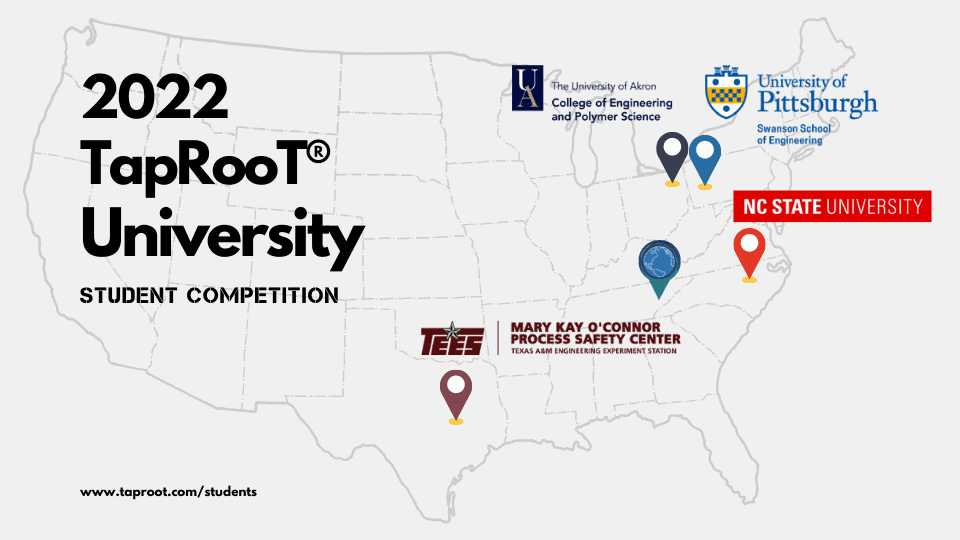 Undergraduate and Graduate-level engineering teams from prestigious US universities will receive virtual training from TapRooT® certified instructors, coaching from their mentors, and given an incident to analyze. Then, the teams will participate in the first TapRooT® Student Competition.