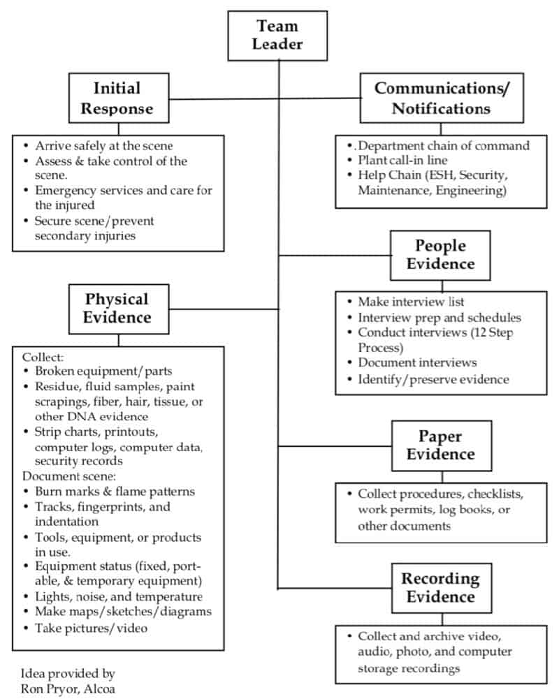 • Outline requirements for auditing and improving the investigation process - Prepare for evidence preservation. Ensure that evidence is preserved by people in the field and first responders by having them use the SAy ESPN technique (described in the next section). Evidence preservation also needs to be considered for the investigation team (during the investigation) and after the investigation (retention of evidence for legal proceedings). Also, you should plan to preserve evidence while sharing it with legal authorities (Fire Marshall or police investigators) or governmental regulatory bodies (in the United States: CSB, DOT, EPA, FDA, MSHA, NTSB, NRC, OSHA, …).
