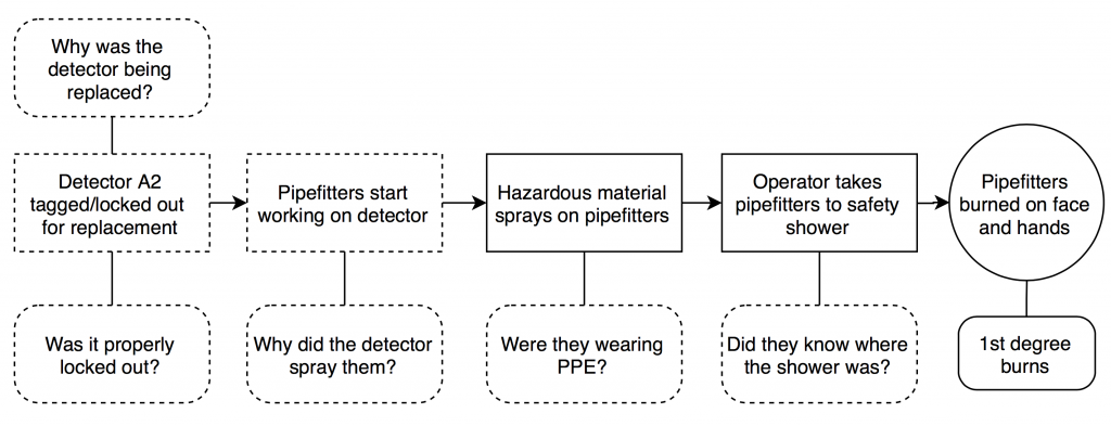 On a planning SnapCharT® Diagram, recognizing what you do NOT know may be as important as what you do know. In this example, you do not know why they were replacing the detector. You don’t know if the lockout/tagout was properly performed. You don’t know if the proper PPE was being worn or if the pipefitters knew where the safety shower was. Thus, you use dashed symbols (boxes or ovals) to display information that has not been proven to be a fact (verified by two independent sources) and for questions.