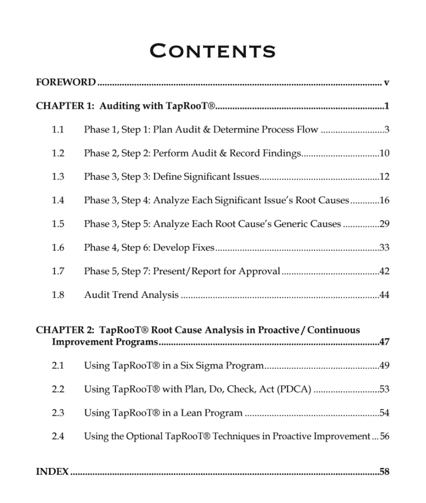 What’s in Book 6, TapRooT® Root Cause Analysis for Audits and Proactive Performance Improvement? The cover (front and back) and table of contents are shown below…