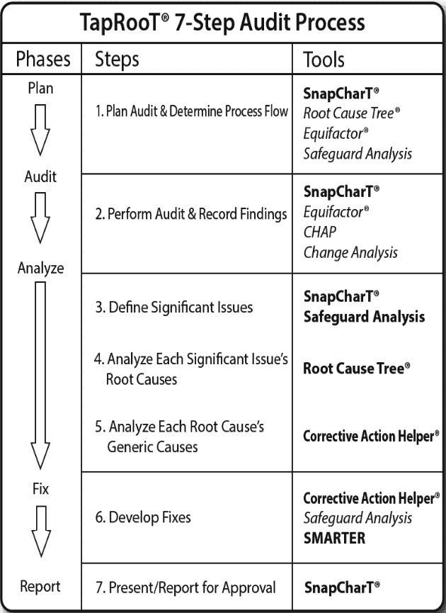The TapRooT® Root Cause Analysis System is a robust, flexible system for analyzing and fixing problems. The complete system can be used to analyze and fix simple or complex accidents, difficult quality problems, hospital sentinel events, and other issues that require a completed understanding of what happened and the development of effective corrective actions. However, wouldn’t it be better if you never had to investigate in the first place? How can TapRooT® RCA and proactive audits help you do this? By improving your audits.