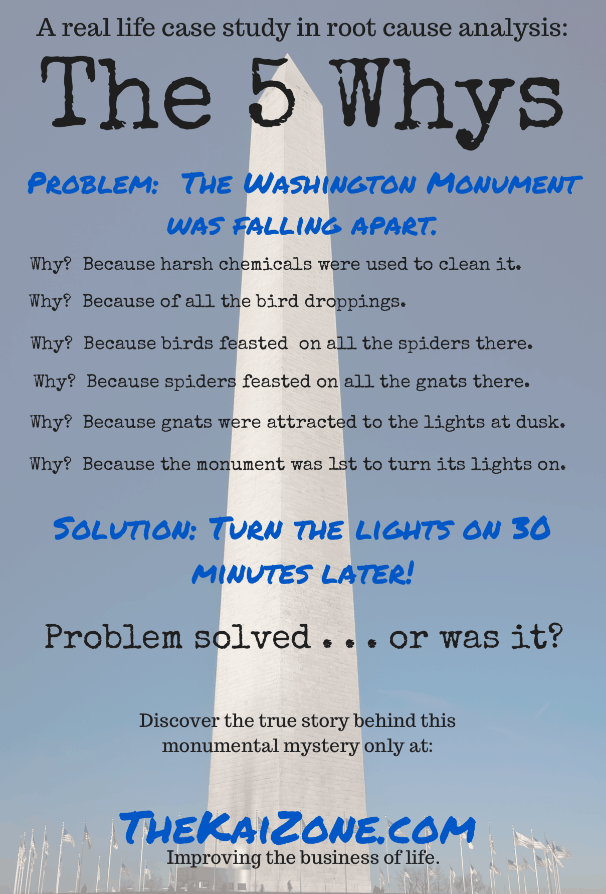 By the way, here is a blog post that completely debunks the bug example. The real analysis was a $2 million dollar study that took two years to complete (not somebody asking “Why?” five times) and led to a $25 million dollar corrective action program. The lighting change was tried and might have been successful, BUT it was not implemented because of tourist complaints. So much for a truthful example.