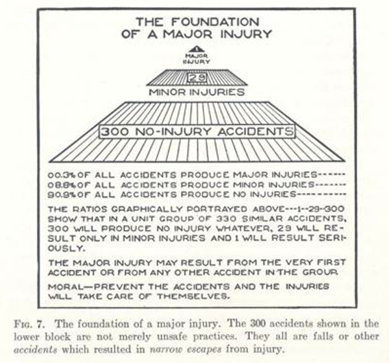 Note: If you observe the pyramids closely, they changed over the years. Heinrich wrote that the base of his pyramid (300 No-Injury Accidents) was from accidents similar to the minor injuries and major injuries at the top of the pyramid, and the “no-injury accidents” were: