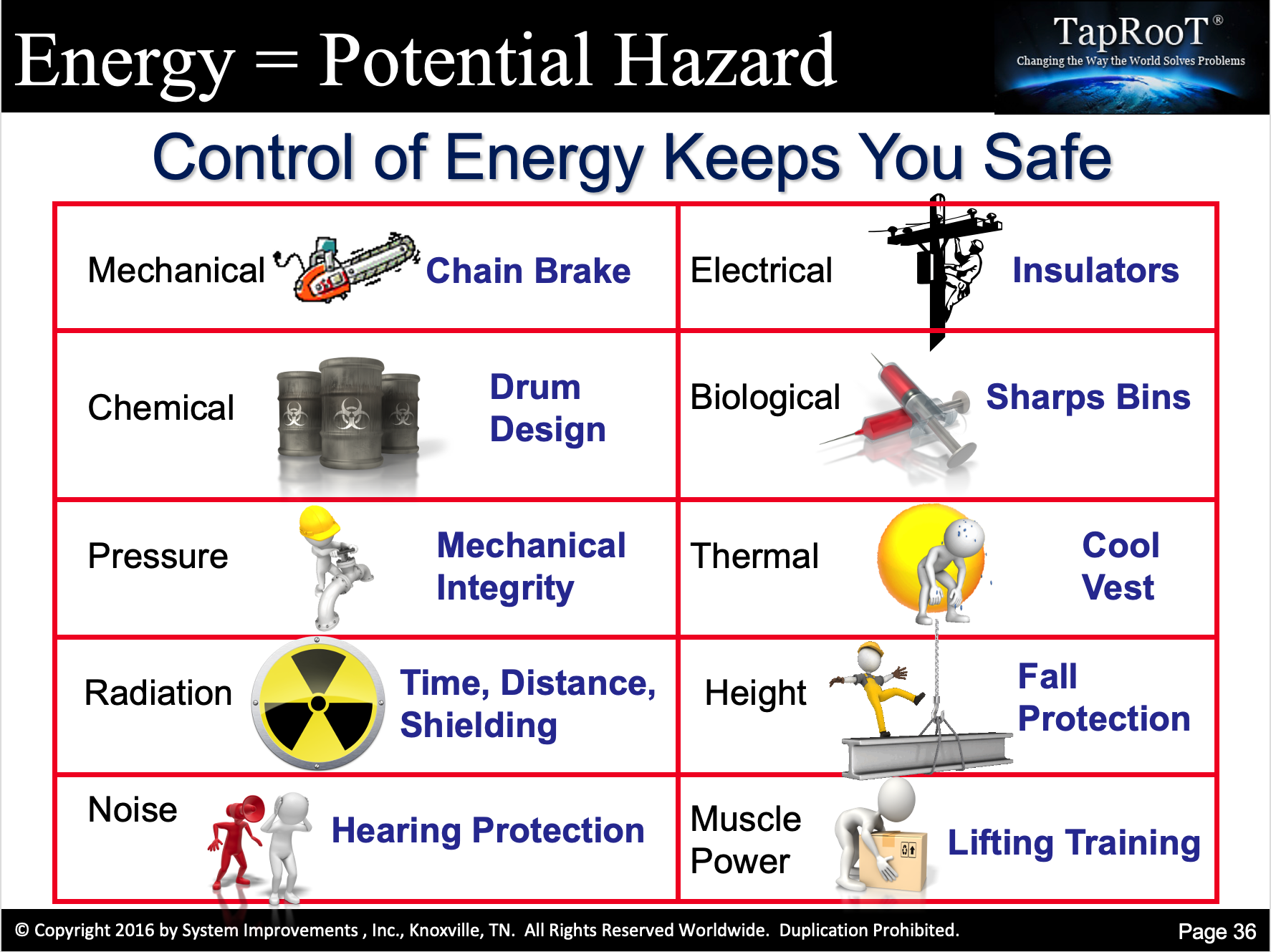 These are similar to the Hazards/Energies taught in our TapRooT® Root Cause Analysis Training for the past 30 years…