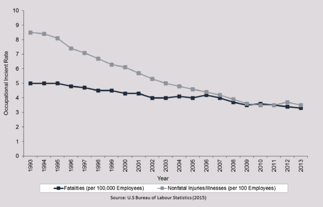Here is a graph from a 2015 article in Professional Safety titled Preventing Serious Injuries & Fatalities that demonstrates the mismatch of trends that got the discussion started: