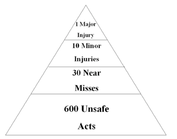 Thus, they could have caused injuries if slightly different circumstances had occurred. Therefore, they have similar causes to minor injuries or major injuries that are further up the pyramid. This is a significant difference from the two more modern pyramids that don’t claim that all 600 unsafe acts or behaviors could have caused fatalities or major injuries.