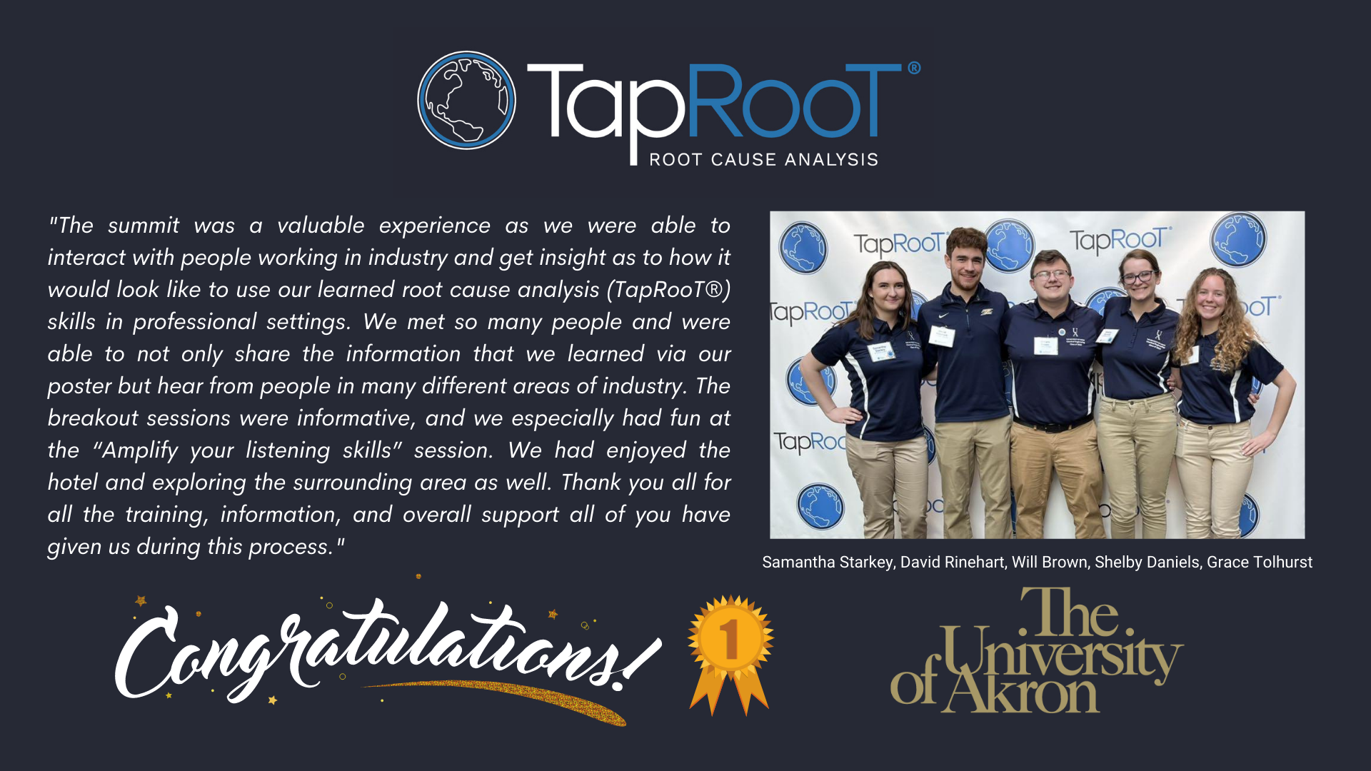 “The summit was a valuable experience as we were able to interact with people working in industry and get insight as to how it would look like to use our learned root cause analysis (TapRooT®) skills in professional settings. We met so many people and were able to not only share the information that we learned via our poster but hear from people in many different areas of industry. The breakout sessions were informative, and we especially had fun at the “Amplify your listening skills” session. We had enjoyed the hotel and exploring the surrounding area as well. Thank you all for all the training, information, and overall support all of you have given us during this process.”