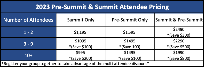 Note that if you register for a pre-Summit Course and the Summit at the same time, you receive $300 OFF the course fee,