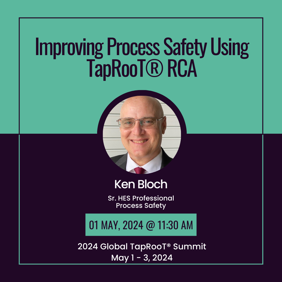 Ken Bloch will discuss “Improving Process Safety Using TapRooT® RCA.” It’s a great way to assess critical process safety issues at your facilities using the proven TapRooT® techniques. Ken will go over some examples of how using TapRooT® RCA can be used both proactively and reactively to prevent future process safety types of incidents.