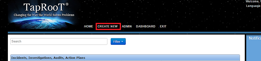 Today I am going to talk about how to create a new Incident, Investigation or Audit. If this is the first time using TapRooT® VI you may notice that the look has changed and a few things have been added. To create an Incident, Investigation or Audit, simply click on the “Create New” tab and then select Incident, Investigation or Audit.