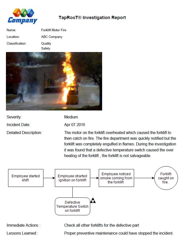 Let’s take a walk through a report construction zone. On this walk, we will explore some of the features and elements that can be added to your report in TapRooT® VI and how it can make your reports stand out. But first, I would like to show an example of a finished product then explain how we got the report and help you get an understanding of the different fields for your reports.