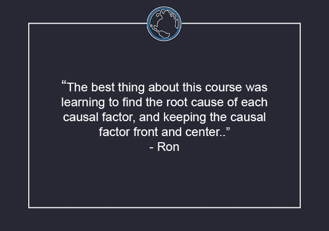 - “The best thing about this course was learning to find the root cause of each causal factor, and keeping the causal factor front and center.” – Ron