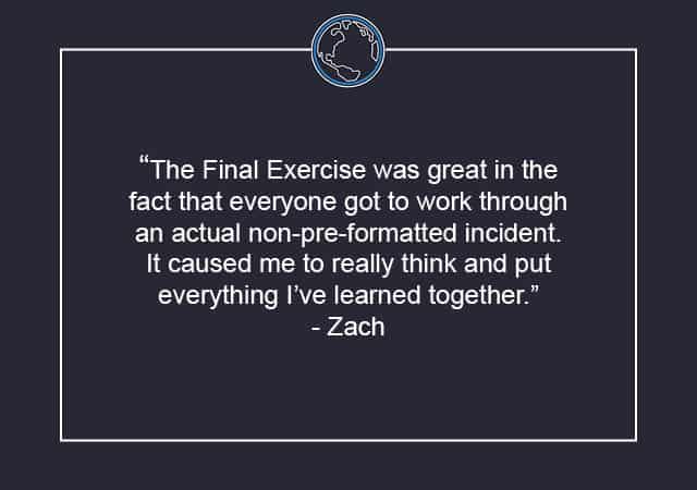 - “The Final Exercise was great in the fact that everyone go to work through an actual non pre-formatted incident. It caused us to really think and put everything we had learned together.” – Zach