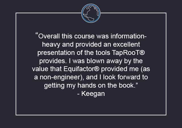 - “Overall this course was information heavy and provided an excellent presentation of the tools TapRoot® provides. I was blown away by the value that Equifactor® provided me (as a non-Engineer) and I look forward to getting my hands on the book.” – Keegan