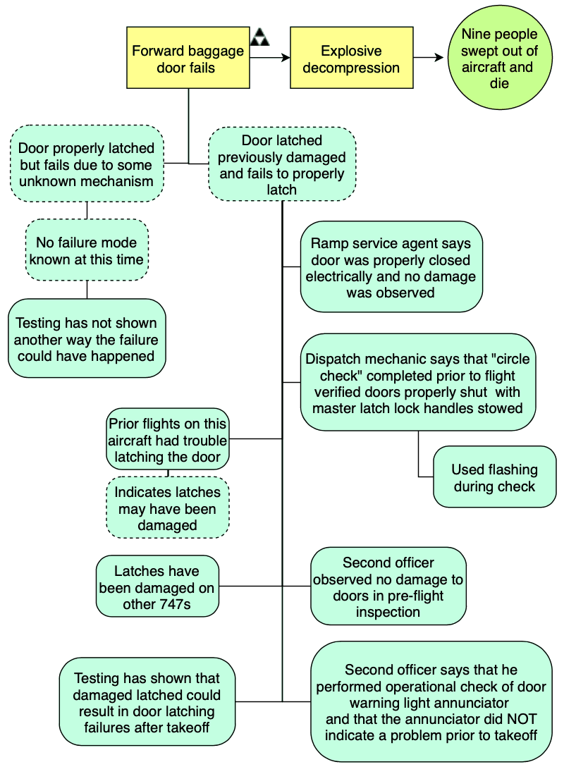In this case with an electric interlock and a piece of metal preventing the doors from opening in flight, the reasonable answer was that the door must not have been closed correctly. A simple human error in hurrying to get the flight out on time caused the death of 9 people. This seemed entirely likely. Other possibilities were not reasonable.