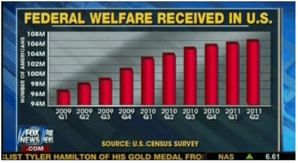 Do you want to make a small change look dramatic? Just chop off the scale. The Y-axis is chopped off at 94 million in the graph above. It makes the increase in federal welfare received look more dramatic. Yes, it did increase but not near as dramatically as this graph looks (like it has gone up by a factor of four). Chopping off part of the scale can mislead the viewer of the graph. Was this intentional? ???