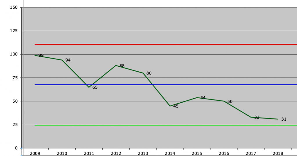 The interesting change is that the lower process limit is now 42. In other words, based on the 2009-2013 data, you have had a significant change in the number of fatalities when you have less than 42 fatalities. This happened in 2017 and 2018.