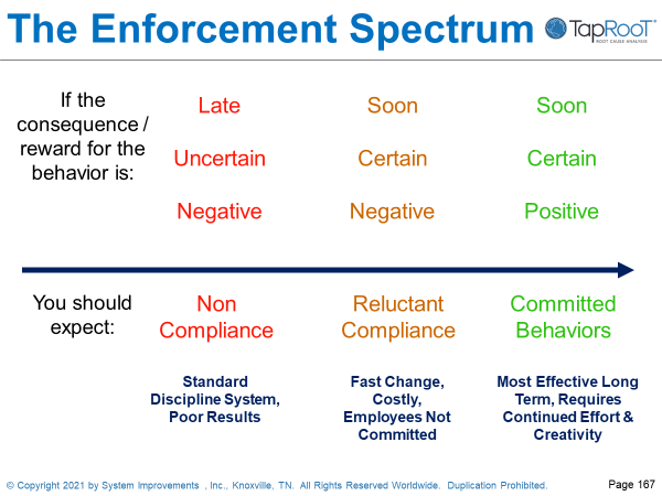 People will always act according to the strongest perceived incentive. TapRooT® RCA has an entire module in our 5-Day Advanced Team Leader Training devoted to motivating desired behavior with incentives.