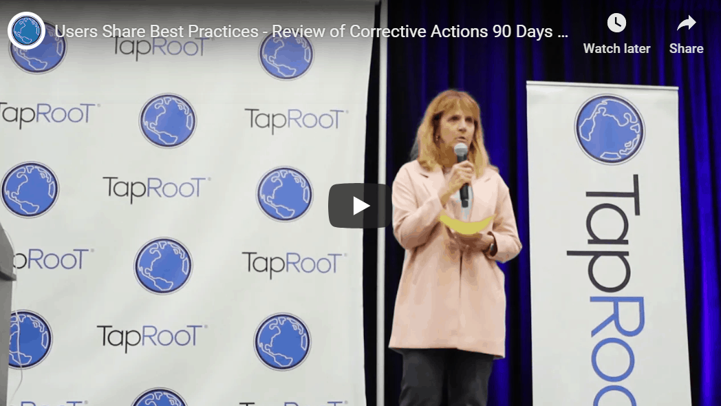 At the TapRooT® Summit, attendees share best practices. Lorraine discusses her company’s practice of reviewing Corrective Actions 90 days after they were implemented.