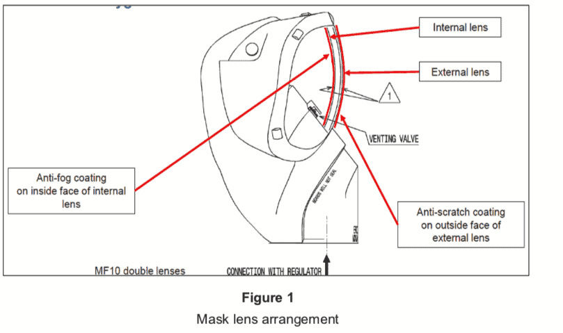 Description: The mask type fitted to G-EZNM was a “MF10” full-face mask-regulator that provides protection during depressurization and smoke events, while allowing the pilots to communicate with each other. The window has two lenses with an air gap between them. The internal lens has an anti-fogging coating (Figure 1).