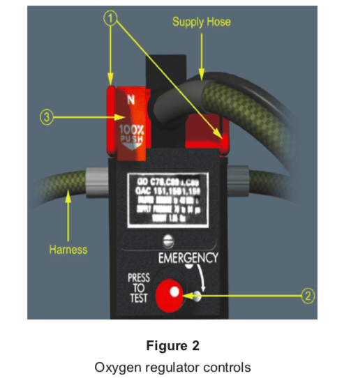 Pushing the n/100% (n – normal flow) selector into the 100% position, on the regulator control, supplies 100% oxygen (item 3 in Figure 2). After pushing the N/100% rocker into 100% position, rotating the emergency pressure selector in the direction of the arrow to the emergency position provides 100% oxygen with an overpressure (item 2 on Figure 2). The overpressure eliminates condensation or fogging of the mask, and prevents smoke, smell or ashes from entering the mask.