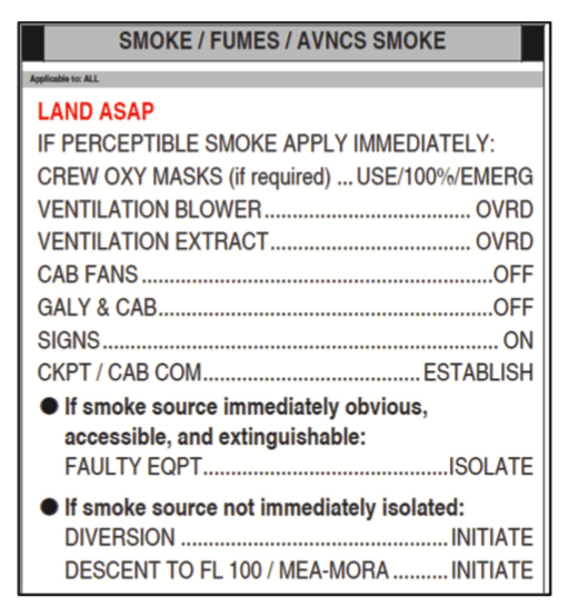 The QRH checklist for ‘SMOKE/FUMES/AVNCS SMOKE’ was as follows: