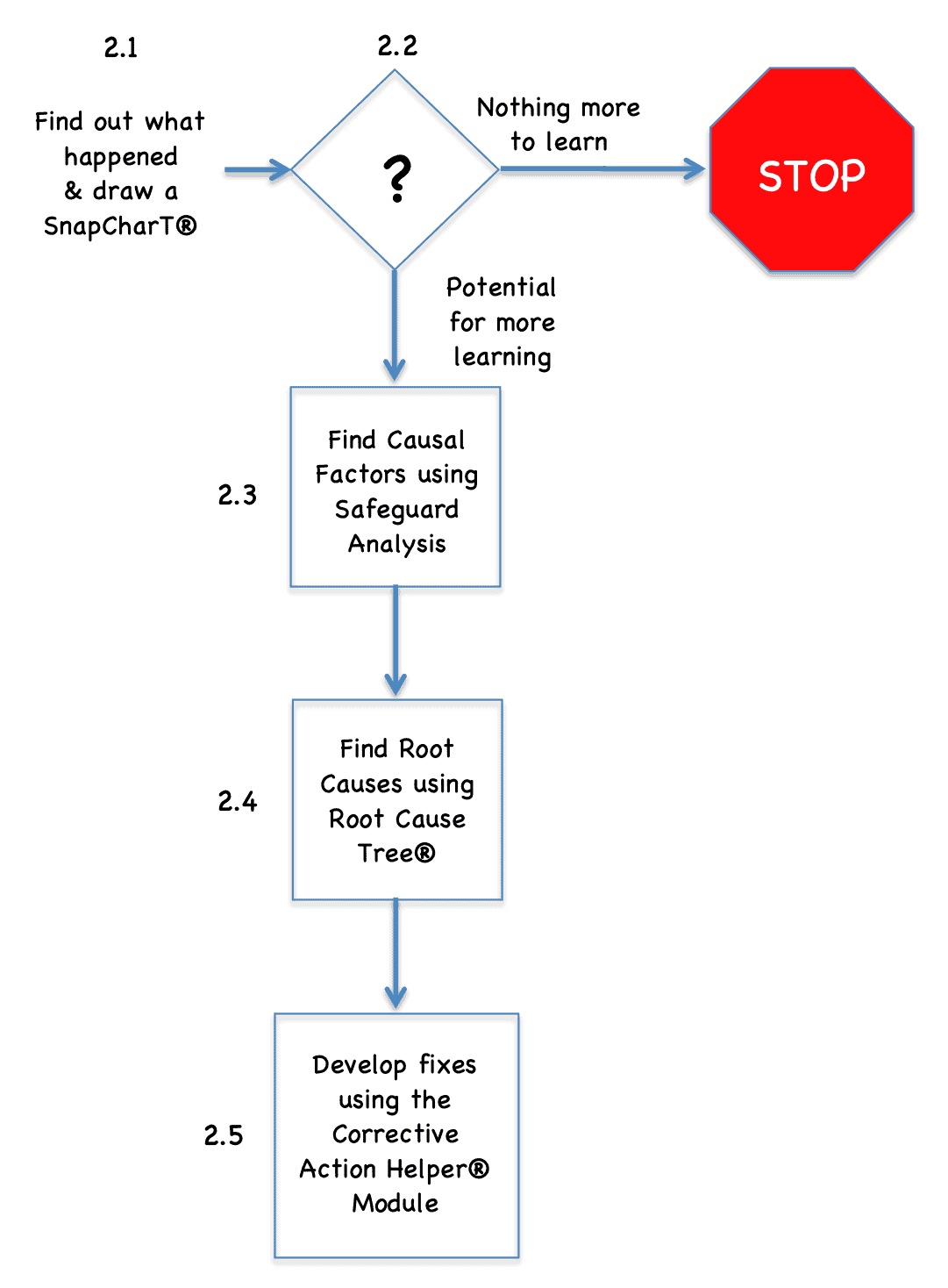 Note that there is a decision step in the simple investigation process shown above. After you develop your initial SnapCharT® of what happened, you can decide that there is nothing more to learn and stop the investigation without identifying the Causal Factors or the Causal Factors’ root causes.